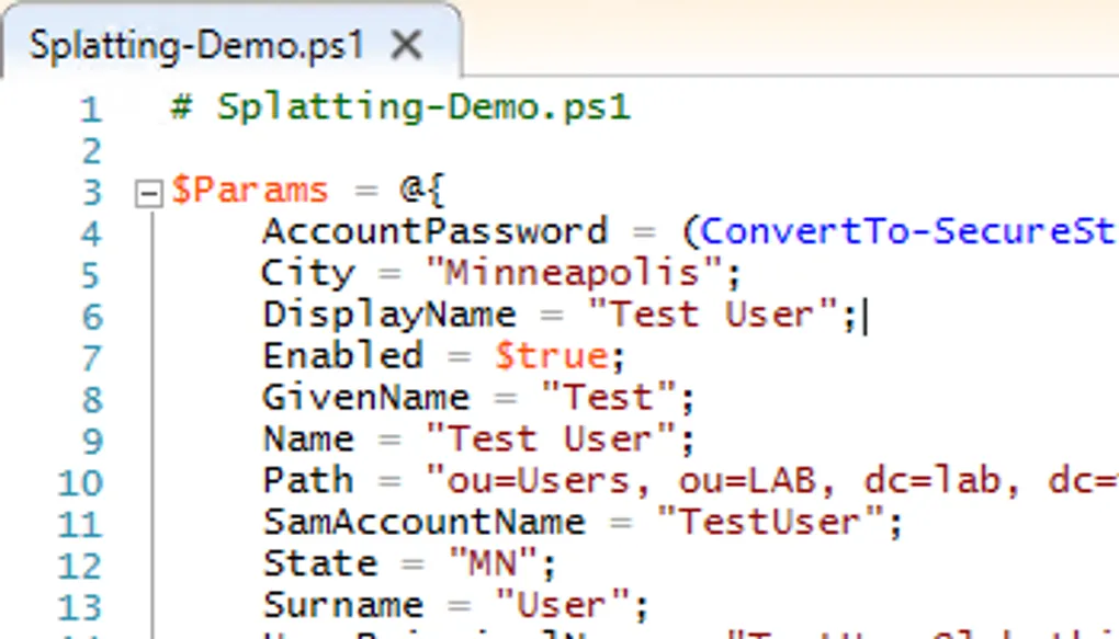 The benefit of using splatting is readability. Instead of having to stretch your parameter assignments out horizontally, Splatting gives us a clean, concise, readable format that extends vertically in which to assign values to our parameters. For the splatting variable, we can either use an array or a hash table. Let’s take a look.