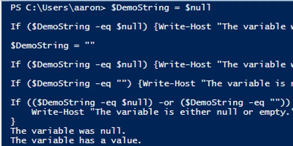 Learn the difference between a null, empty string, and white space value for a PowerShell variable and how to test for them.